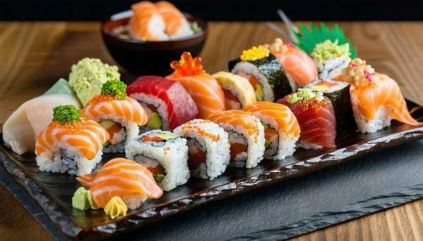8x Nori, Ryż, paluszki krabowe, 8x ryż, nori, łosoś, 8x ryż, nori, ogórek, 8x ryż, nori, krewetka, 8x ryż, nori, awokado, 8x ryż, nori, węgorz, 8x ryż, nori, ogórek, marynowany tuńczyk, kiełki chilli, 8x ryż, nori, pieczony łosoś, tobiko, 8x nori, ryż, mango, serek śmietankowy