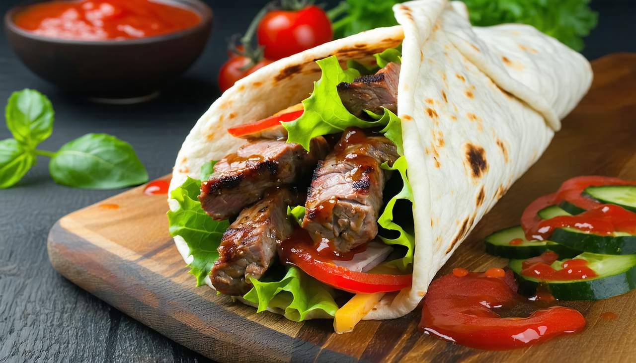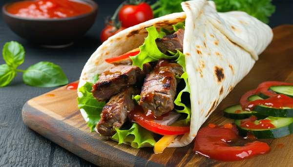 Mięso, sos, surówki, ogórki, pomidory, feta, sałata lodowa, oliwki