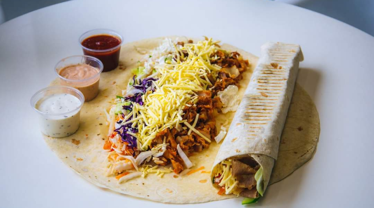 Mięso do wyboru, frytki lub ryż, sałata lodowa, biała kapusta, czerwona kapusta, ogórek zielony, pomidor,cebula, sosy do wyboru