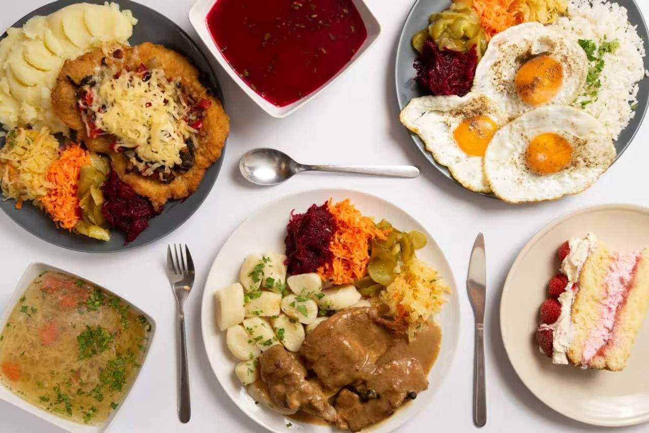 Łódzka zalewajka, schab panierowany, ziemniaki, surówka buraki, kompot