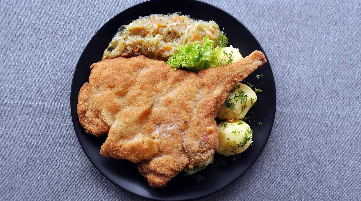 podawany z suróówką z białej kapusty, do wyboru: ziemniaki gotowane, kasza lub ryż