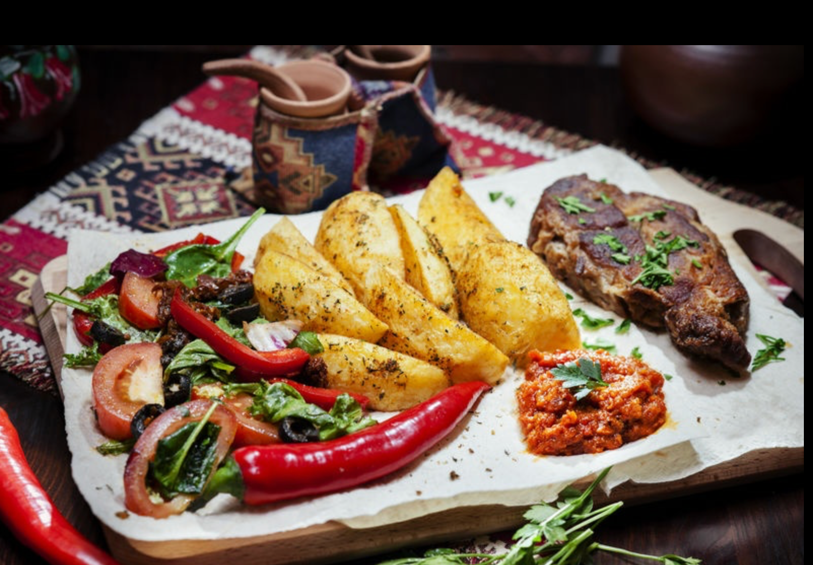 Grillowana karkówka, kebaby, sałatka ormiańska, kartoszki z ziołami, adżika oraz talerz lawaszów.