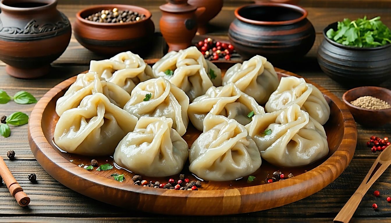 Gruzińskie pierożki wypełnione farszem z baraniny i wołowiny z dodatkiem świeżej kolendry i esencjonalnym bulionem