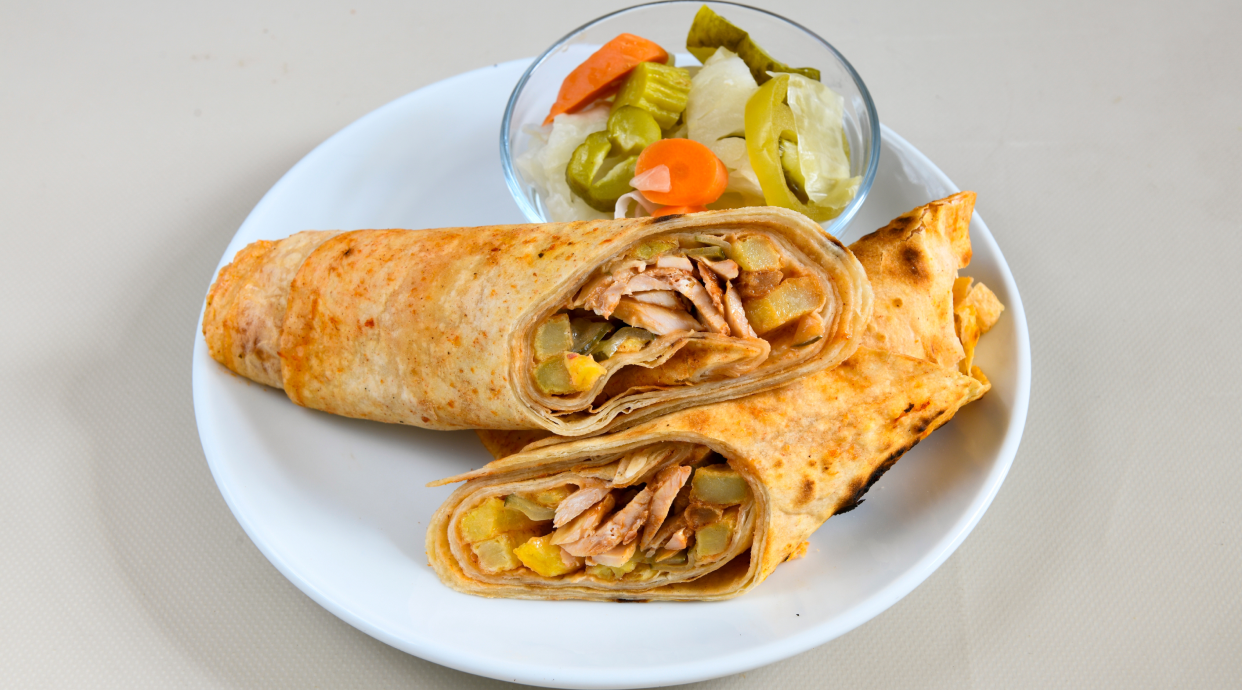 z kebabem wołowo-baranim lub kurczakiem, surówką, ogórkiem, pomidorem, chlebem cienkim pita, sosami i pastą czosnkową, hummusem i serem