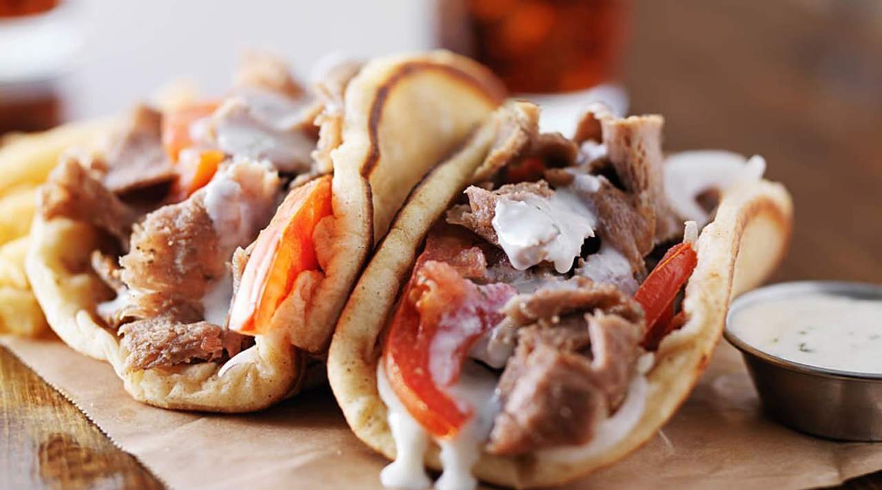 Pieczone mięso, cienki chleb, grecka sałatka, sos do wyboru, pasta czosnkowa, ser feta lub frytki