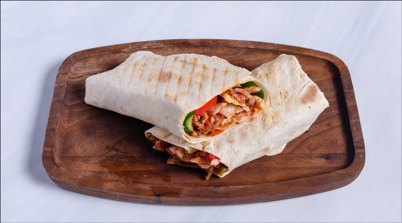 Lipie (libańska tortilla): 50g, Mięso: 130g, Frytki: 110g, Sałatki: 125g, Sosy 85g Razem: 500g