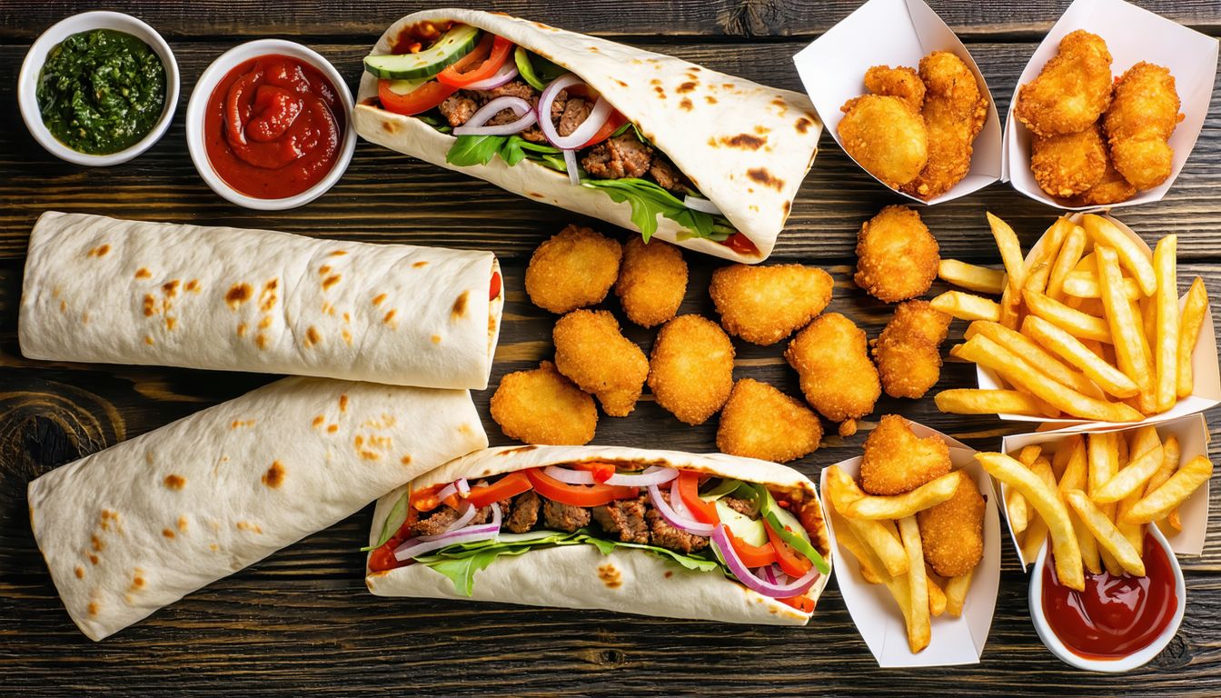 Mięso, kapusta, marchewka po koreańsku, ogórek, pomidor, papryka, oliwki, ser feta, frytki, sos.