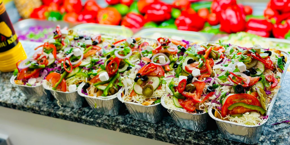 halloumi lub falafel , pomidor , ogórek, ogórek konserwowy, papryka , jalapeno , chilli , ser sałatkowy , cebula , oliwki, sałata lodowa, czerwona kapusta, kapusta pekińska , kapusta z marchewką