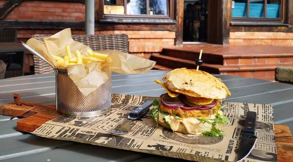 Burger Mexico wołowina, sos francuski, rucola, czerwona cebula, jalapeno, sos red curry, nachosy, ser cheddar
