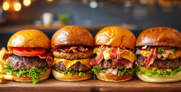 chrupiąca bułeczka, 100% wołowiny, warzywa, ser, bekon, autorskie sosy, sos bbq