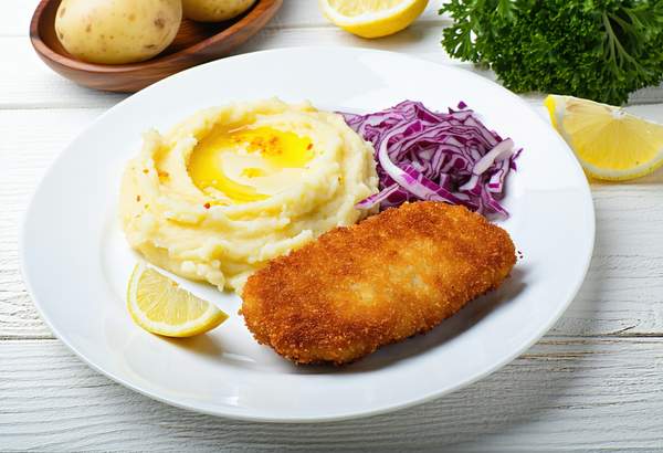 Schab panierowany,ziemniaczki pieczone,kapustka zasmażana