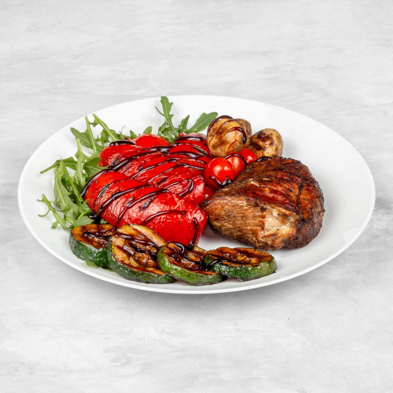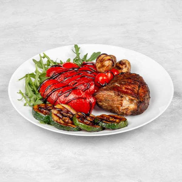 2 steki wieprzowe, duszona cebula, papryka, pieczarki, zapiekane z serem, frytki lub ryż, surówka, 3 sosy, pita