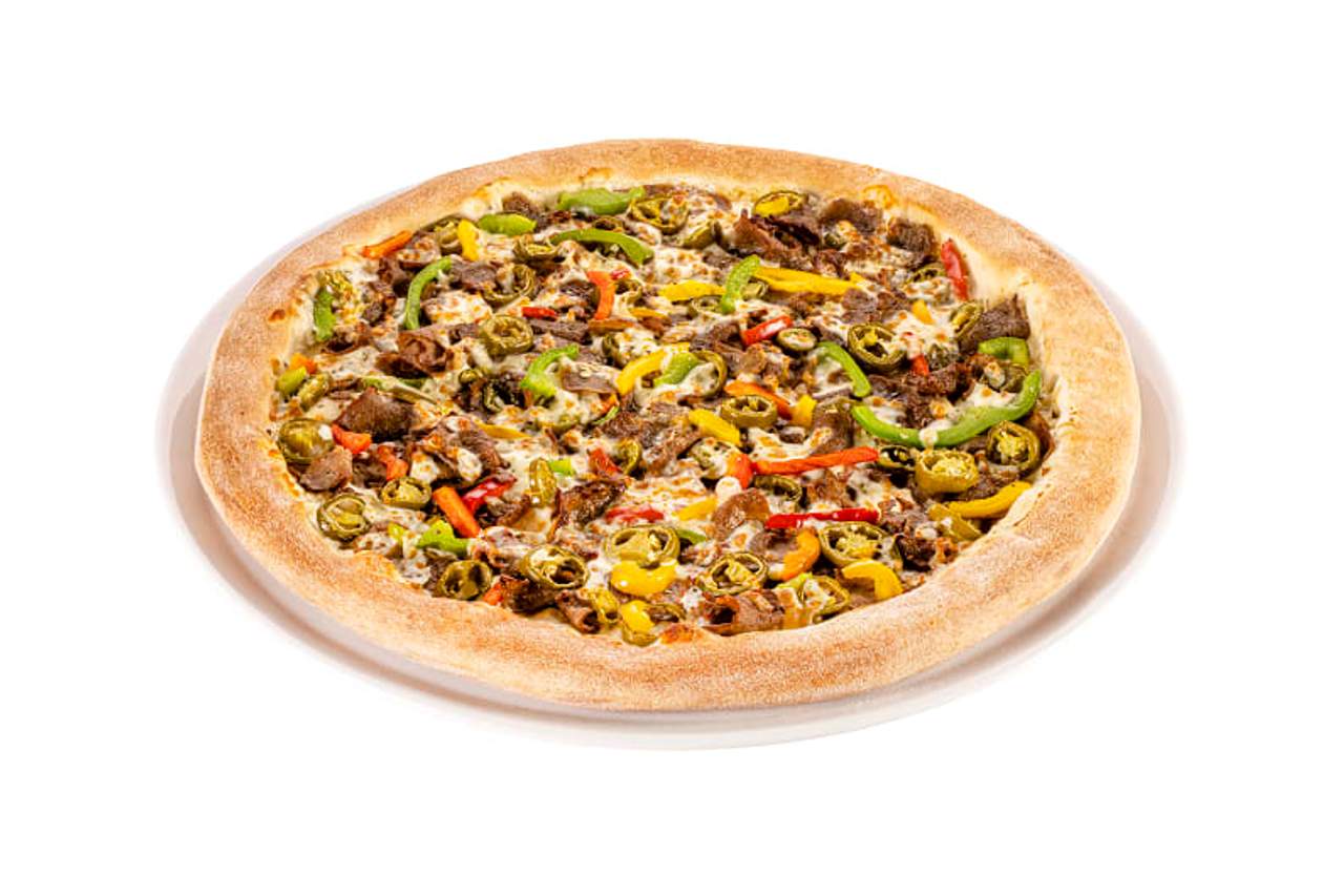 Sos pomidorowy, papryka, cebula, ogórek konserwowy, kebab wołowy , oregano, ser