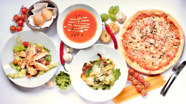 kurczak, pomidor, zielone szparagi, cukinia, rukolą, czosnek, cebula, sos śmietanowo-bazyliowy / ok. 450 g