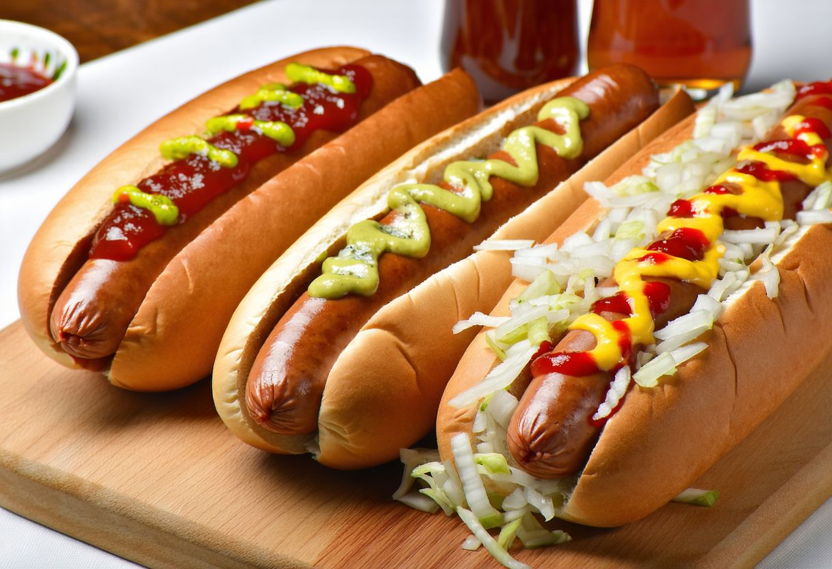Klasyczny hot dog z kiełbasą mleczną, ketchupem, musztardą, sosem majonezowym i mieszanką suchej karmelizowanej cebuli i suszonych jabłek