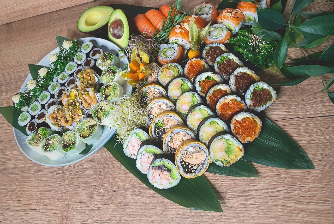 ft. z pieczonym na słodko łososiem, ft. z gotowaną krewetką, ft. z łososiem i awokado, kab. z opalanym łososiem i kalmarem w tempurze, p.r. z warzywami, ur. z tatarem z łososia, ur. z tatarem z tuńczyka, ur. z okoniem