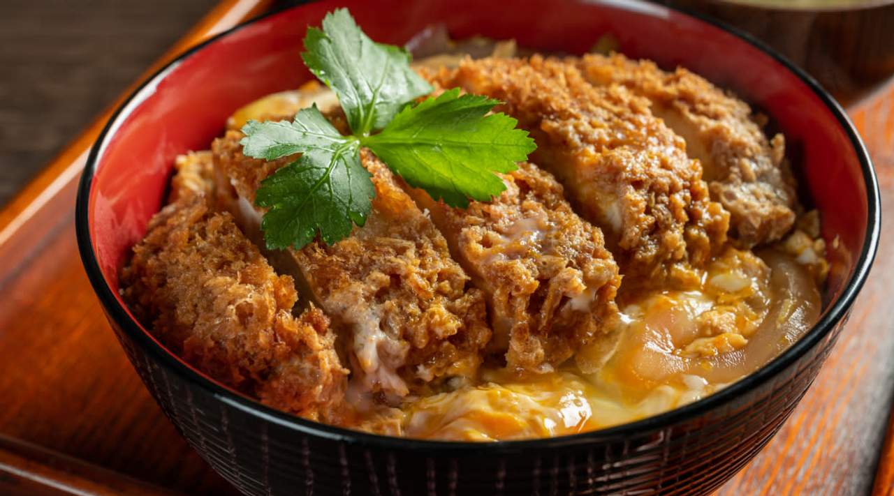 Kotlet wieprzowy z duszoną cebulą w sosie sojowym, podane ze smażonym jajkiem i umieszczone na ryżu.