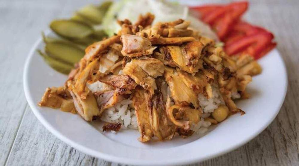 Z ryżem, sosem czosnkowym, kebapem drobiowym lub cielęcym, cebulą, papryką pepperoni i serem