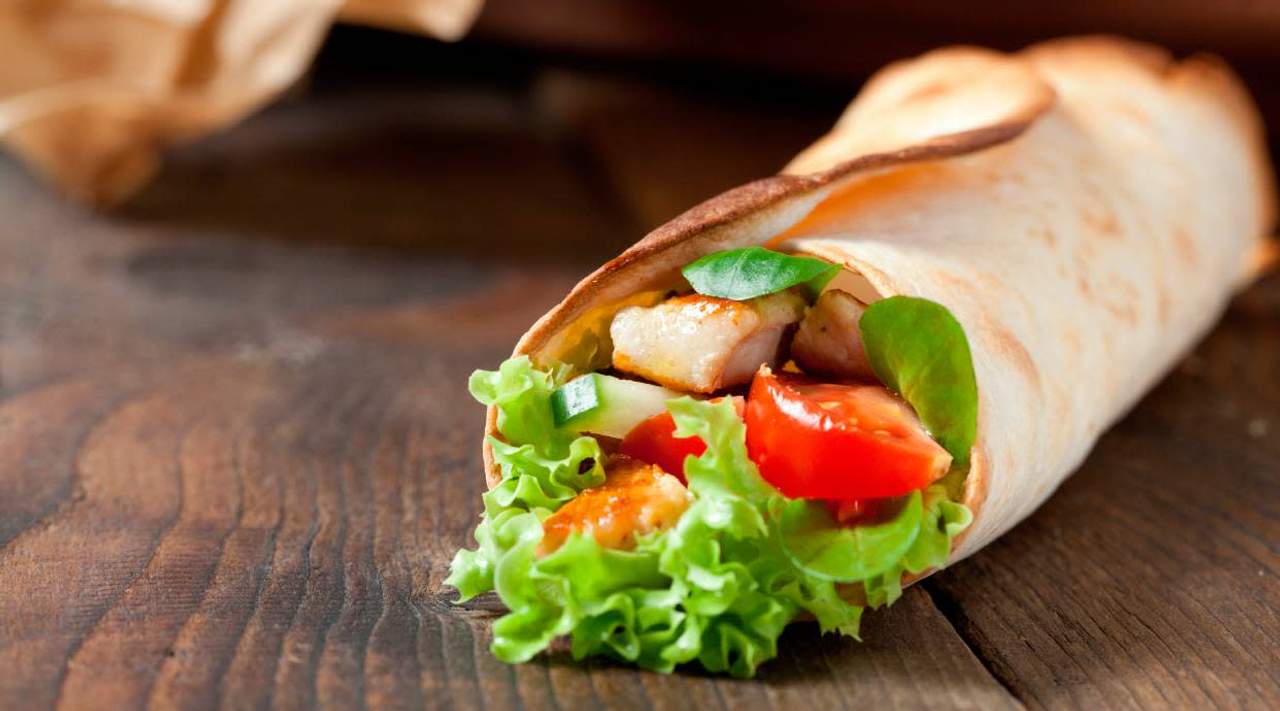 Cienki chleb pita, pieczone mięso, surówka, ogórek, pomidor, sos, pasta czosnkowa