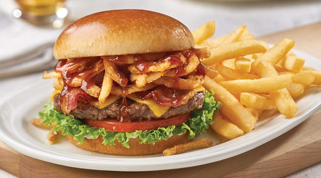 brioche, salatka lodowa, wędzony sos, karmelizowana cebula, wołowina, cheddar, ogórki konserwowe, pomidor