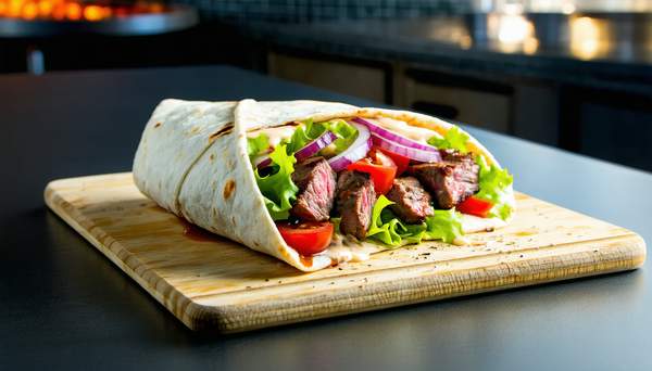 Mięso, sałata lodowa, pomidor, cebula czerwona, sosy*zdjęcie poglądowe