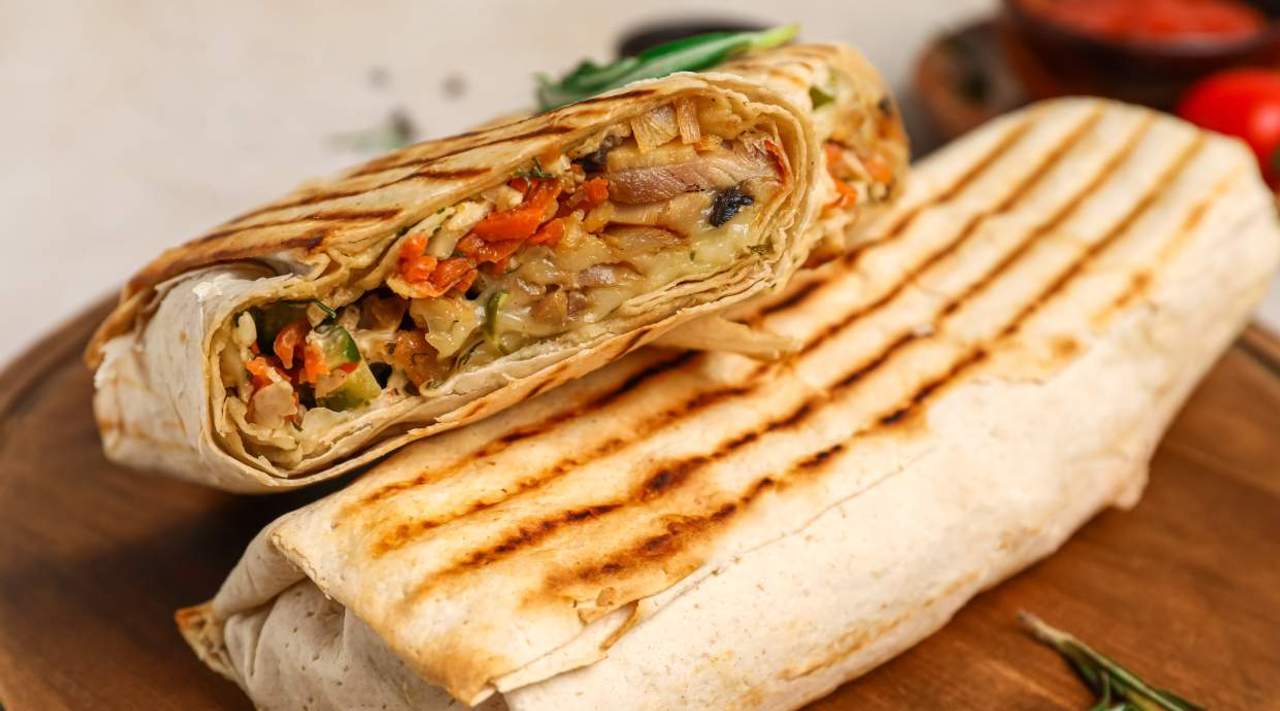 Tortilla, warzywa, falafel, sos