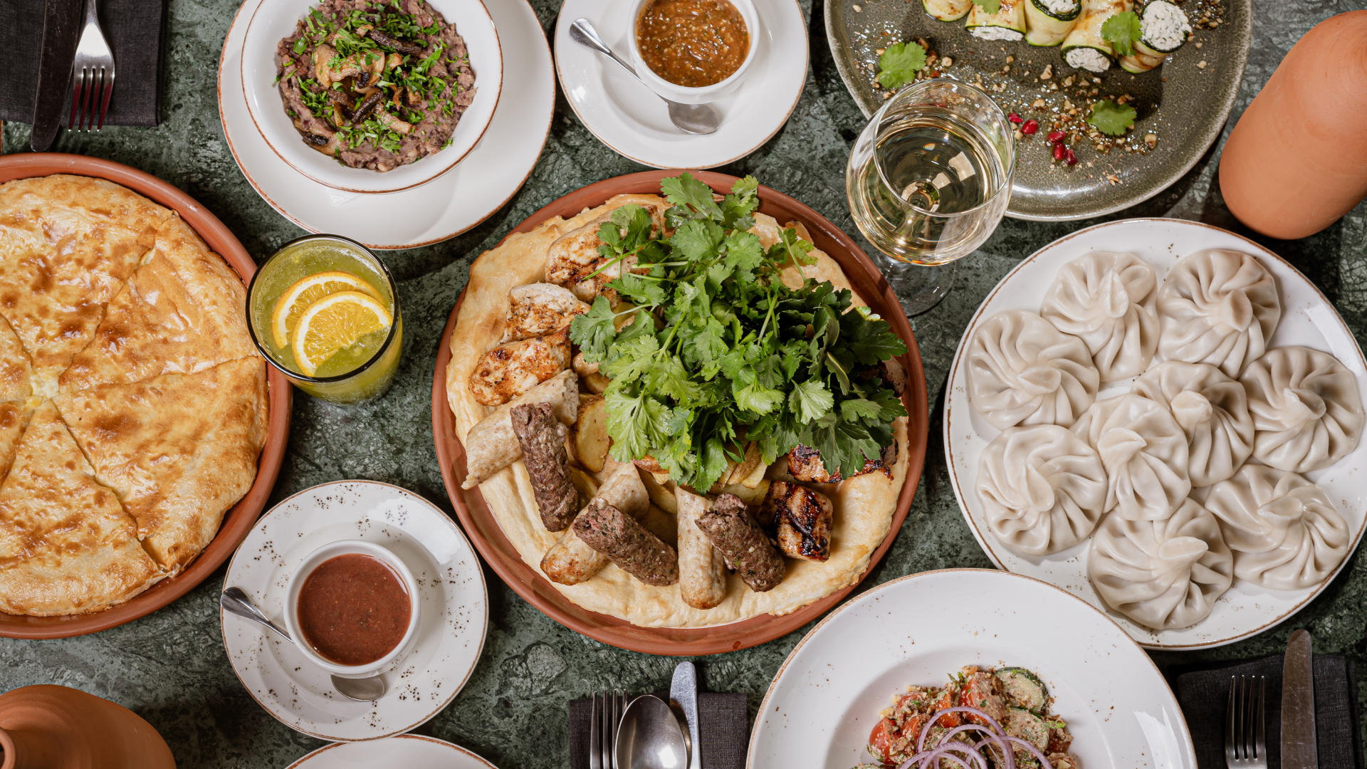 grillowana polędwica wieprzowa, grillowana pierś z kurczaka, kebab z wołowiny, kebab z kurczaka, sos gruziński, adżyka,lawasz, ziemniaki wiejskie