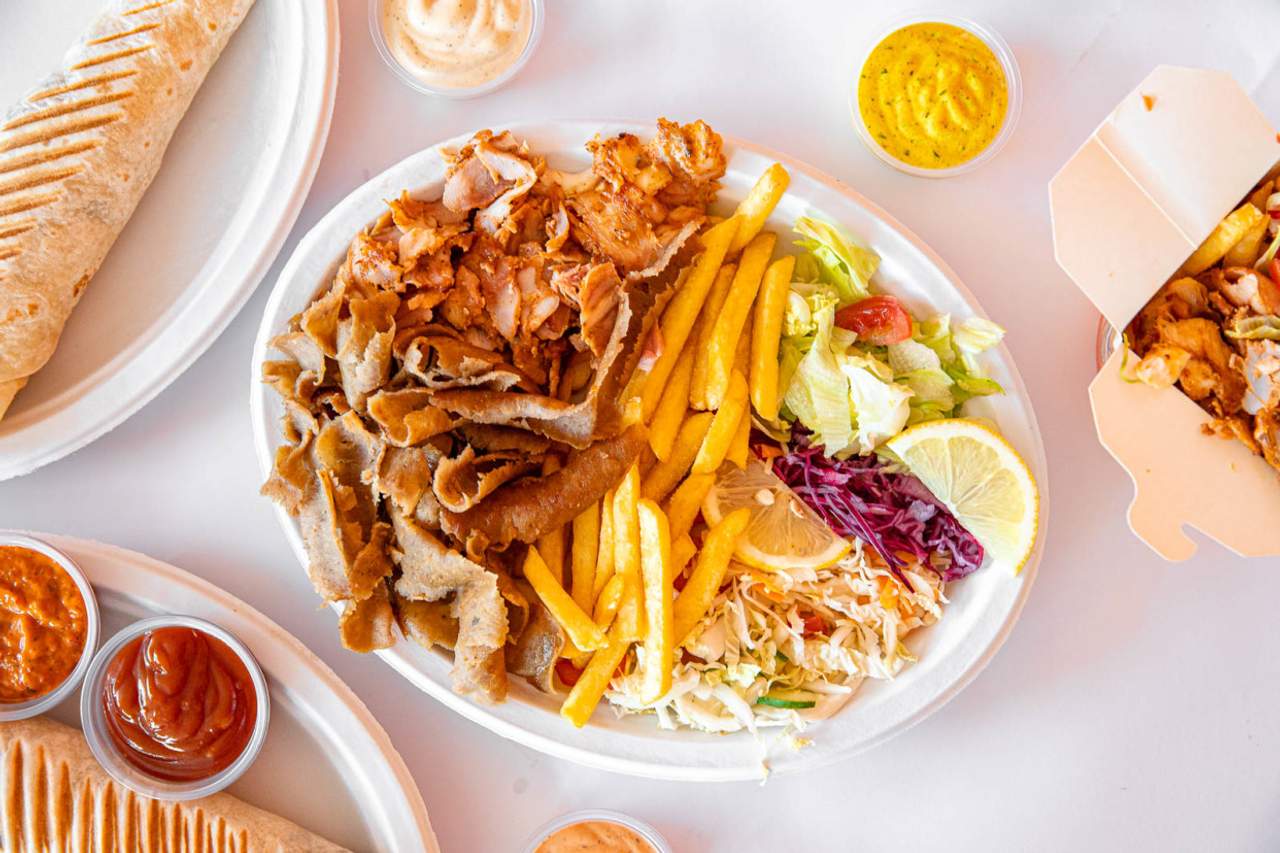 Mięso z kurczaka lub baraniny, surówka, ser, sos