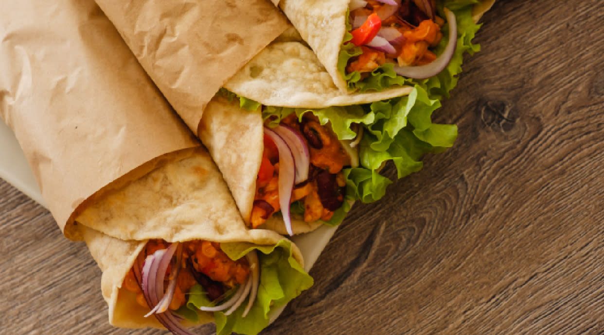 mięso, surówka ( biała kapusta, czerwona kapusta, kapusta pekińska, sałata lodowa, pomidor, ogórek, ogórek korniszon, czerwona cebula, papryka jalapeno, kukurydza) , sos