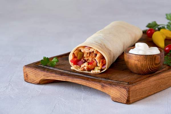 Mięso, surówka, ogórek, pomidor, pasta czosnkowa, sos *zdjęcie poglądowe