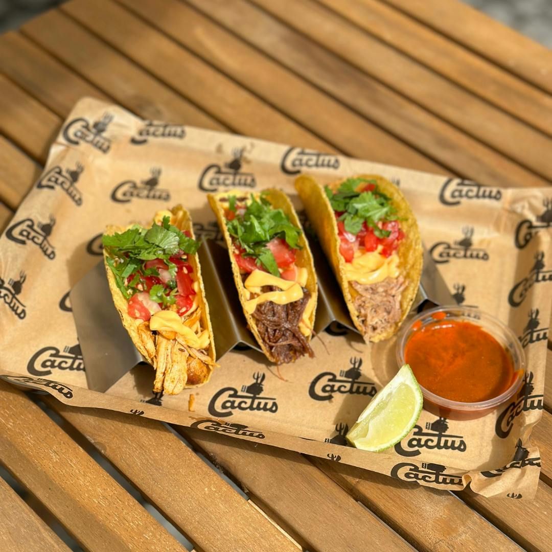 3 chrupiące kukurydziane tortille, mix mięs, dip serowy, Pico De Gallo, kolendra, podawane w zestawie z salsą i limonką.