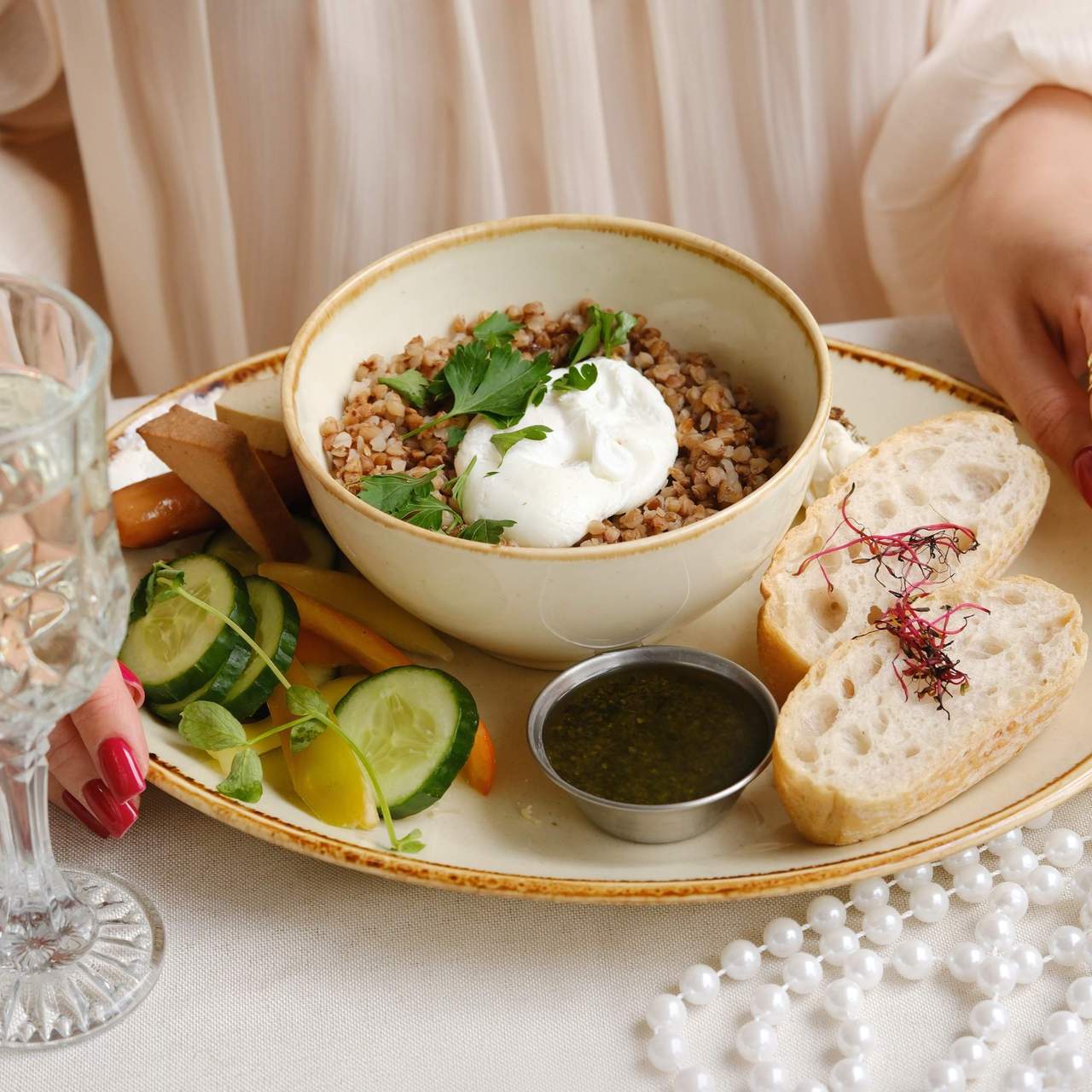 Kasza gryczana, wędliny, sos pesto, jajko w koszulce, warzywa (ogórek, papryka), ser tofu, twarożek, pieczywo