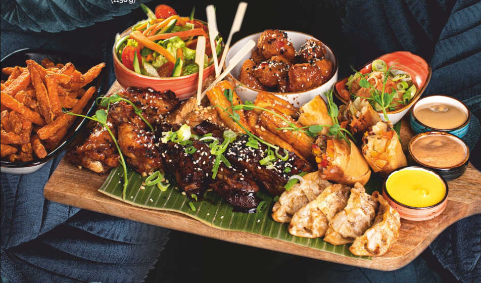żeberka teriyaki, kurczak buffalo, satay z kurczaka, halloumi w miodzie, pierożki gyoza z kaczką, warzywne spring rollsy, kalafiorki panko, mini sałatka warzywna z sosem sezamowym, domowe kimchi, frytki z batatów, 3x dipy