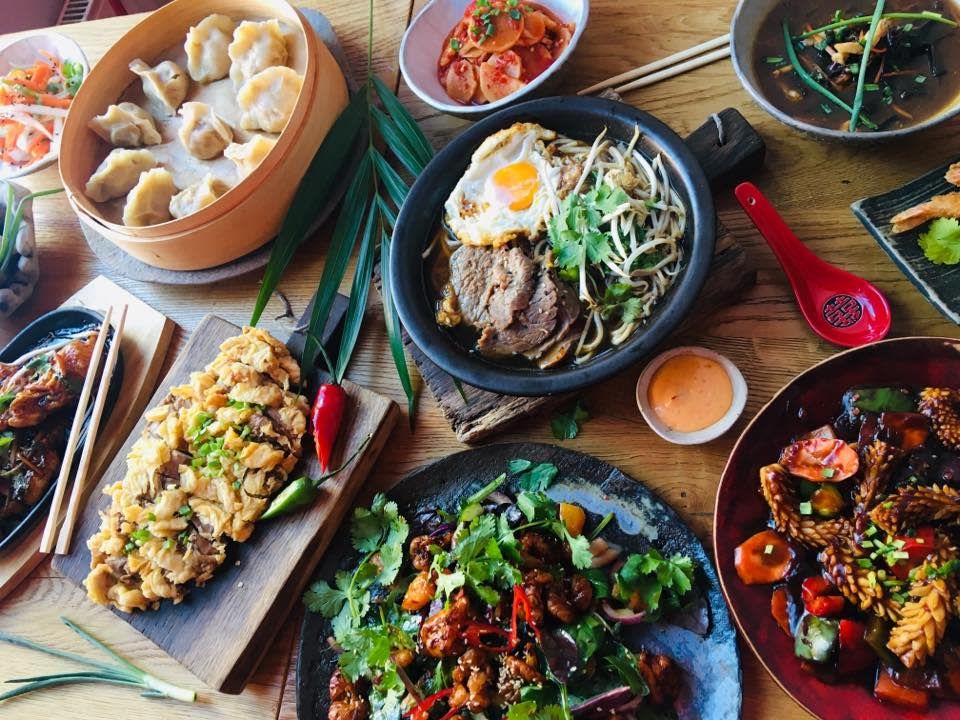 Krewetki, warzywa sezonowe, pędy bambusa, chilli, sos sojowo-ostrygowy