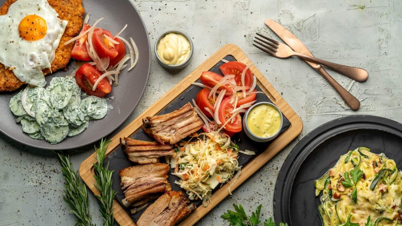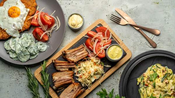 Keto schabowy, który naprawdę syci : 2 kotlety po 120 g, jajko sadzone, palony kalafior, sos serowy, mizeria. B86,8 T46,6 W17,9 Kcal.877,3 Lubi się z KETO Zupą Ogórkową. Cena zawiera koszt opakowana.