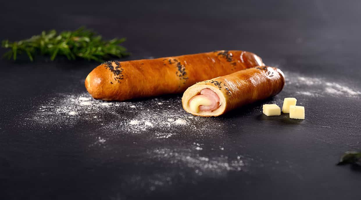 Połączenie, które zadowoli każdego: smaczna parówka, tarty ser, musztarda i ketchup w puszystym precelowym cieście.