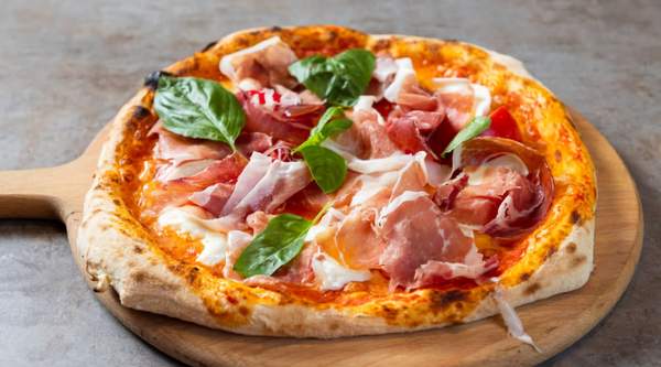 Sos, mozzarella, szynka Prosciutto Crudo, rukola, pomidorki