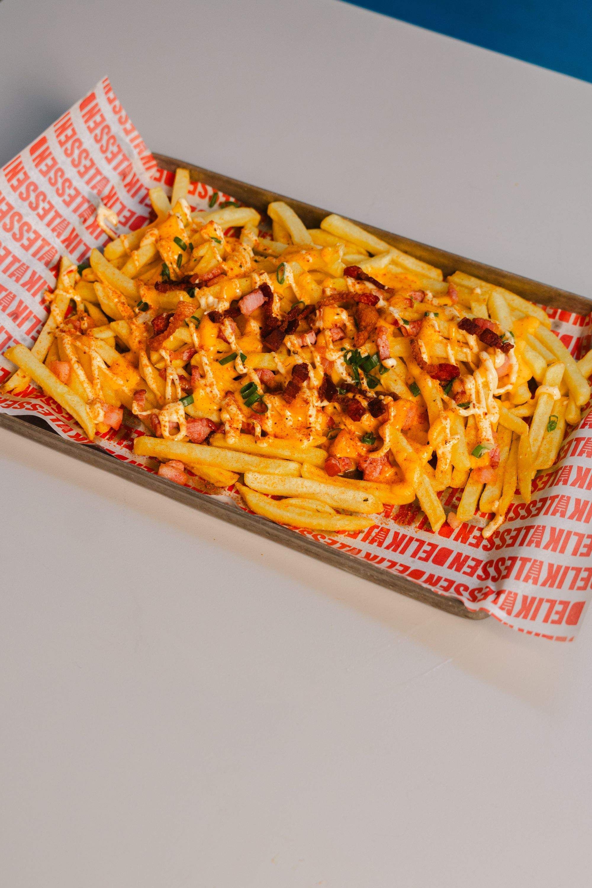 Duża porcja frytek, sos serowy, bekon, sos chipotle, szczypiorek.