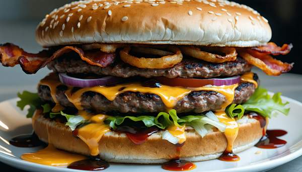 Bułeczka brioche, 100% mięsa wołowego, 2x sos BBQ, ser cheddar, chrupiący bekon, cebula, pomidor, rukola, ogórek kiszony.