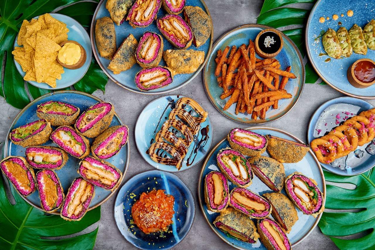 Japońskie stripsy z kurczaka, majonez sweet chilli & żurawina, mozarella wegańska smażona tempura & Pańko