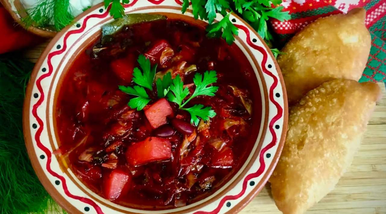 gęsty wegański barszcz ukraiński, podawany z zieleniną, danie bezmięsne i bezglutenowe, bez jaj, 450ml