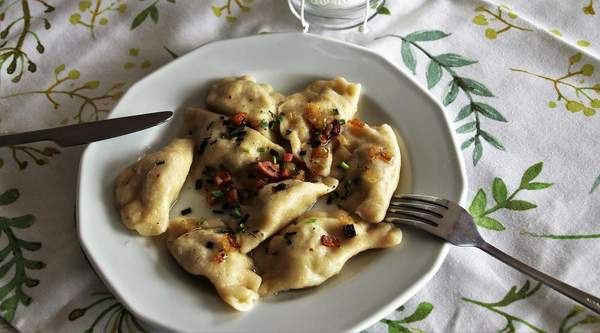 biały ser, ziemniaki, cebula smażona. okrasa z cebulki