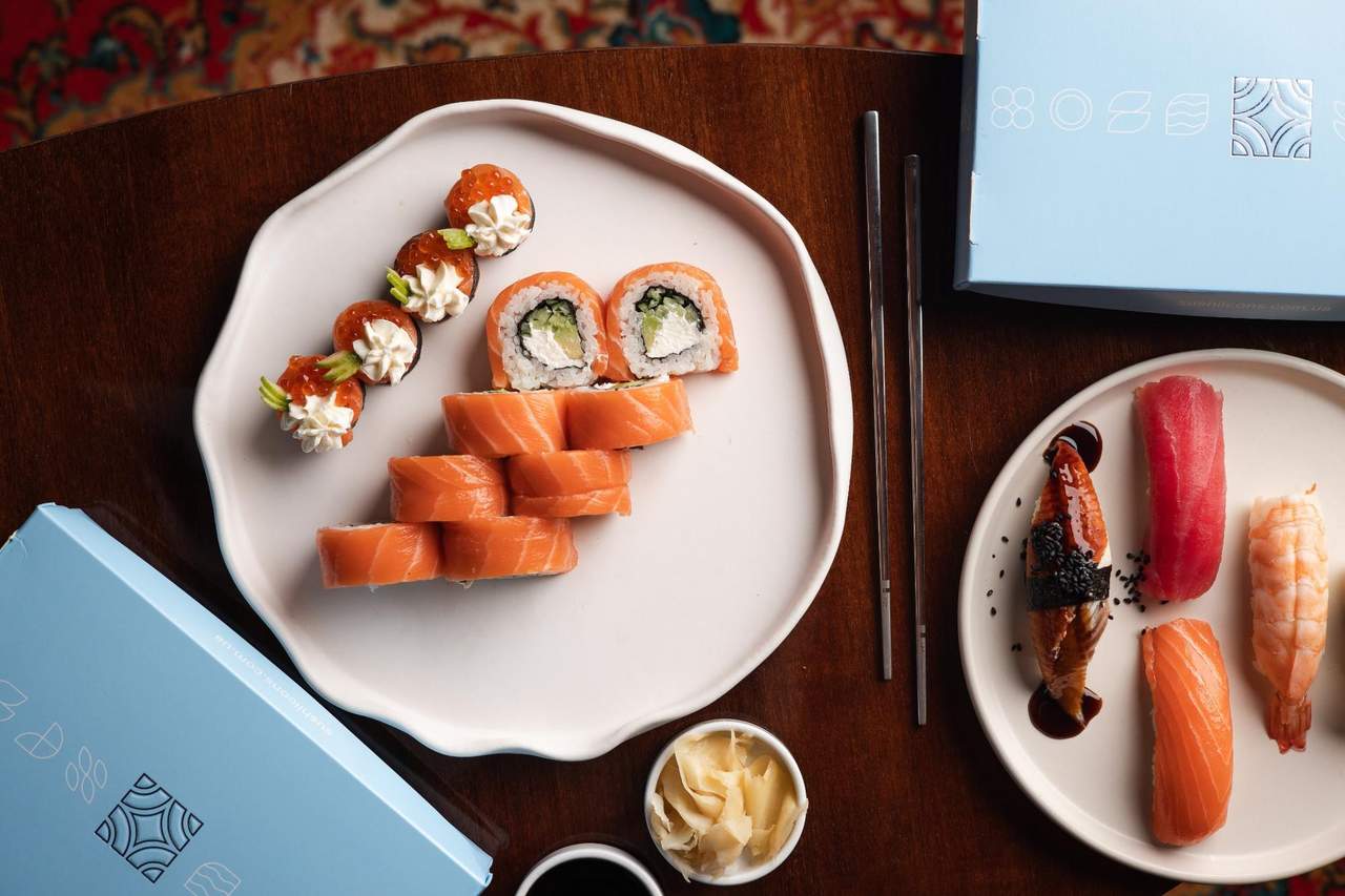 Ryż, nori, ser Philadelphia, pasta truflowa, łosoś, przegrzebek, ajoli imbirowe, ikra z wodorostów, szpinak