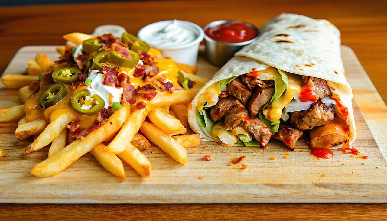 Fryty, sos serowy i majo, chorizo, marynowane jalapeno, prażona cebulka, szczypior