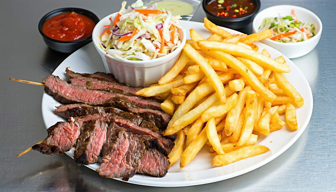 Talerz podawany z mięsem, frytkami, surówkami, sosem i serem *zdjęcie poglądowe