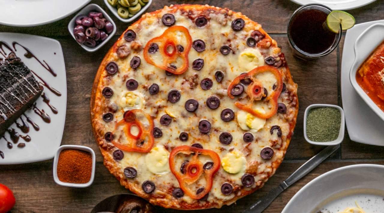 Sos pomidorowy, ser mozzarella, szynka, salami, cebula biała, kukurydza, oregano