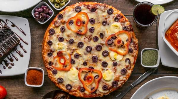 Sos pomidorowy, ser mozzarella, gyros, brokuł, kukurydza, pieczarki, słonecznik, oregano