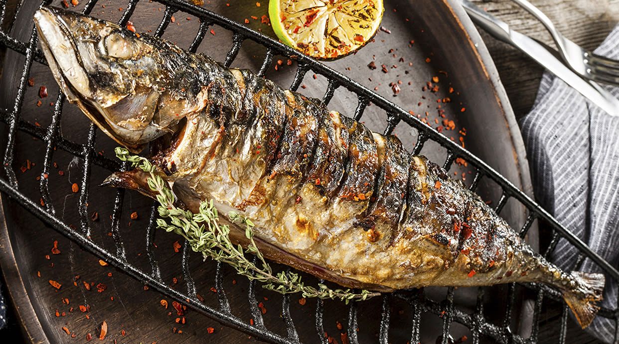 Dourada no carvão escalada batata assada e legumes do dia fio de azeite alho e coentros