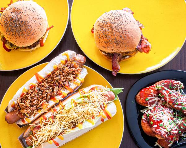 Pão de hotdog, salsicha frankfurt, tomate cherry, alface, cebola caramelizada, batata palha e molhos