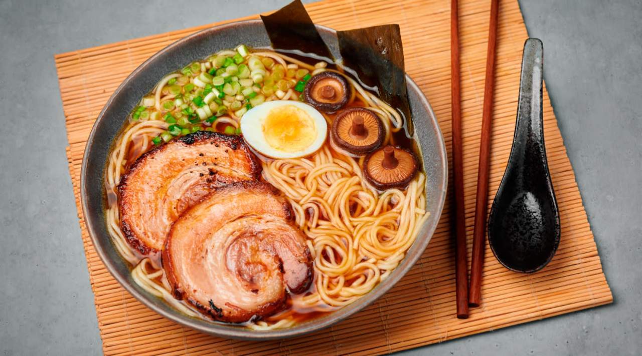 Base de sal, noodles de trigo, porco a baixa temperatura, espinafres, cogumelos, rebentos de soja, caldo de ossos de porco, meio ovo ajitama, alga nori e óleo de chili